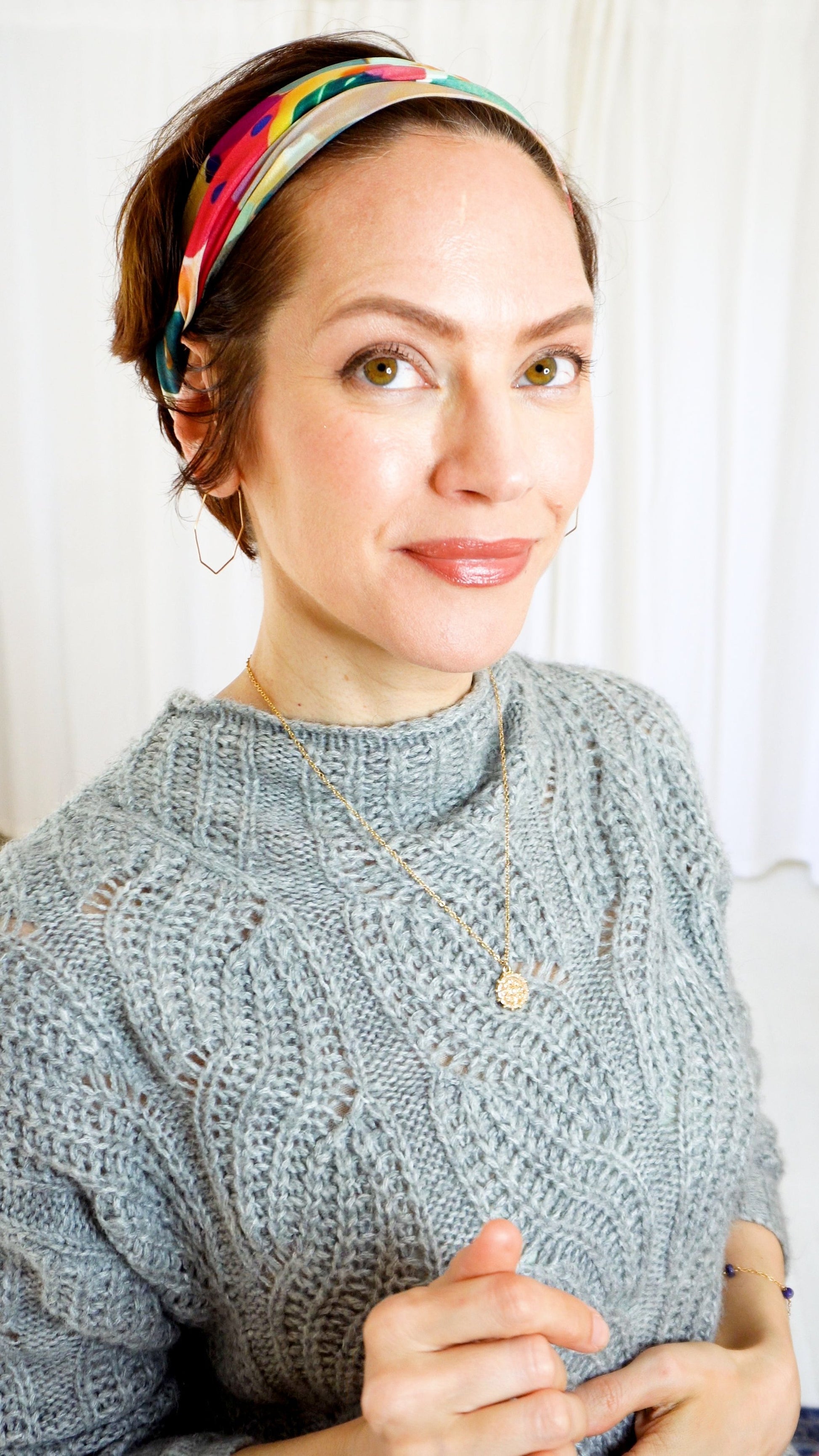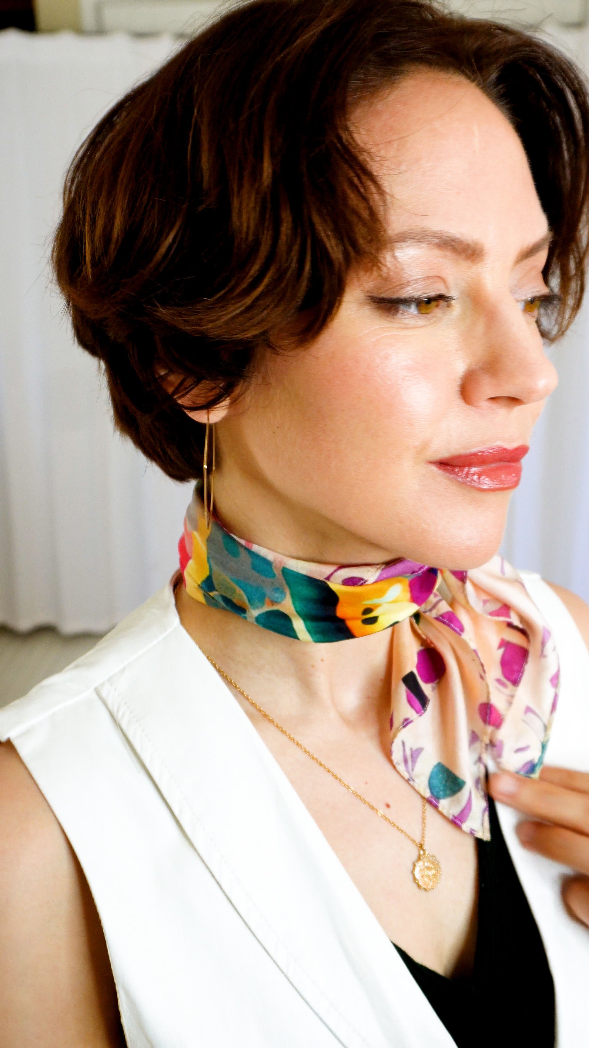 sharon adams The colors and painterly image are beautiful. It is very easy to wear. I feel chic when I tie it around my neck!