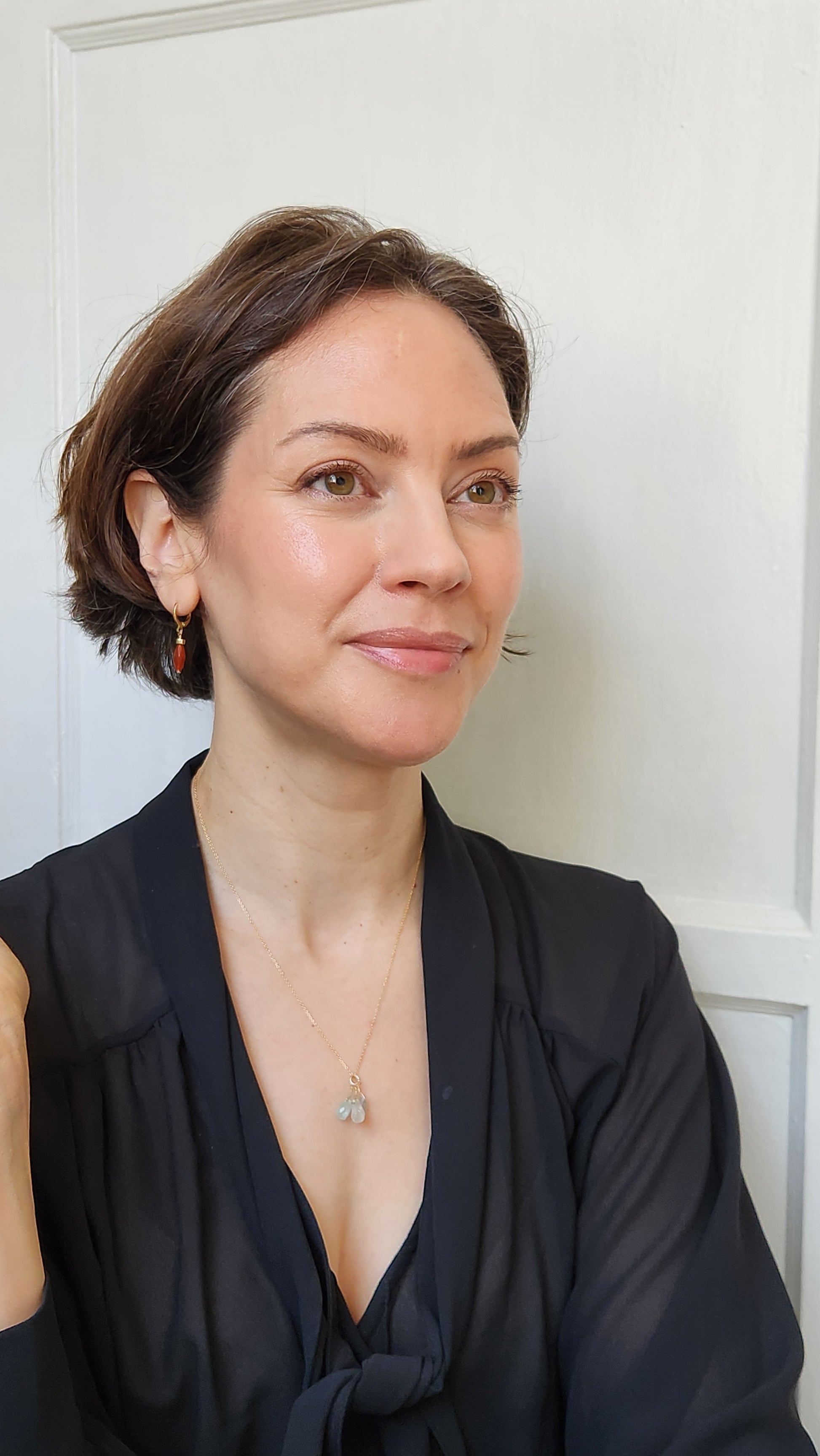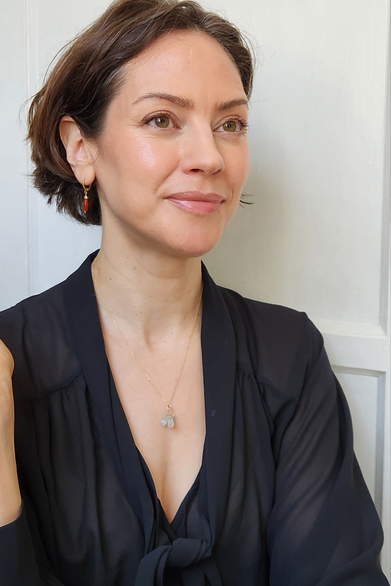 This trio of unusual teardop Aquamarine stones is a real conversation starter! The crackly light blue Aquamarines evoke icy winter, clear skies, wild nature. These teardrops hang from an 18" fine 14k Gold Filled chain. Simple and classic beauty that can be worn with a T shirt and jeans and still be an absolute statement. Shown here with Carnelian Dangle earrings