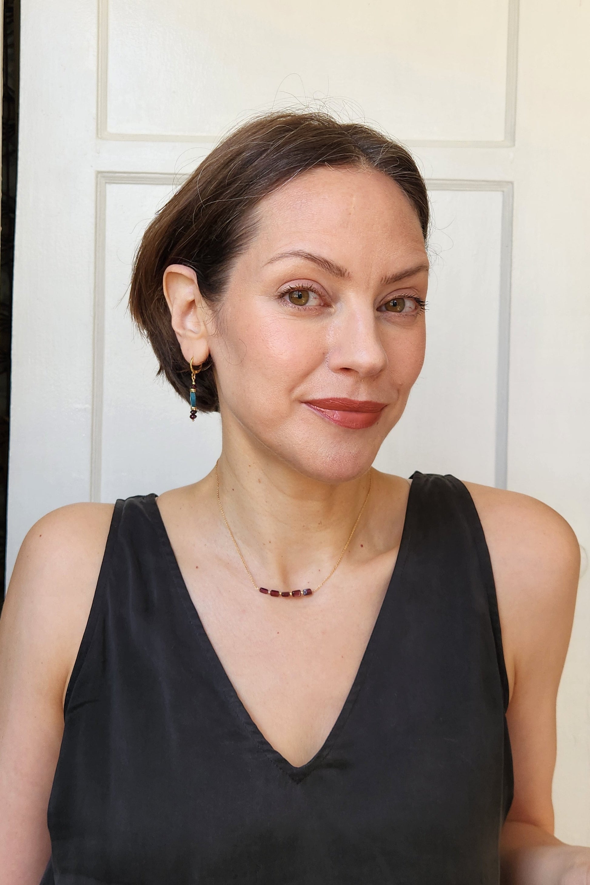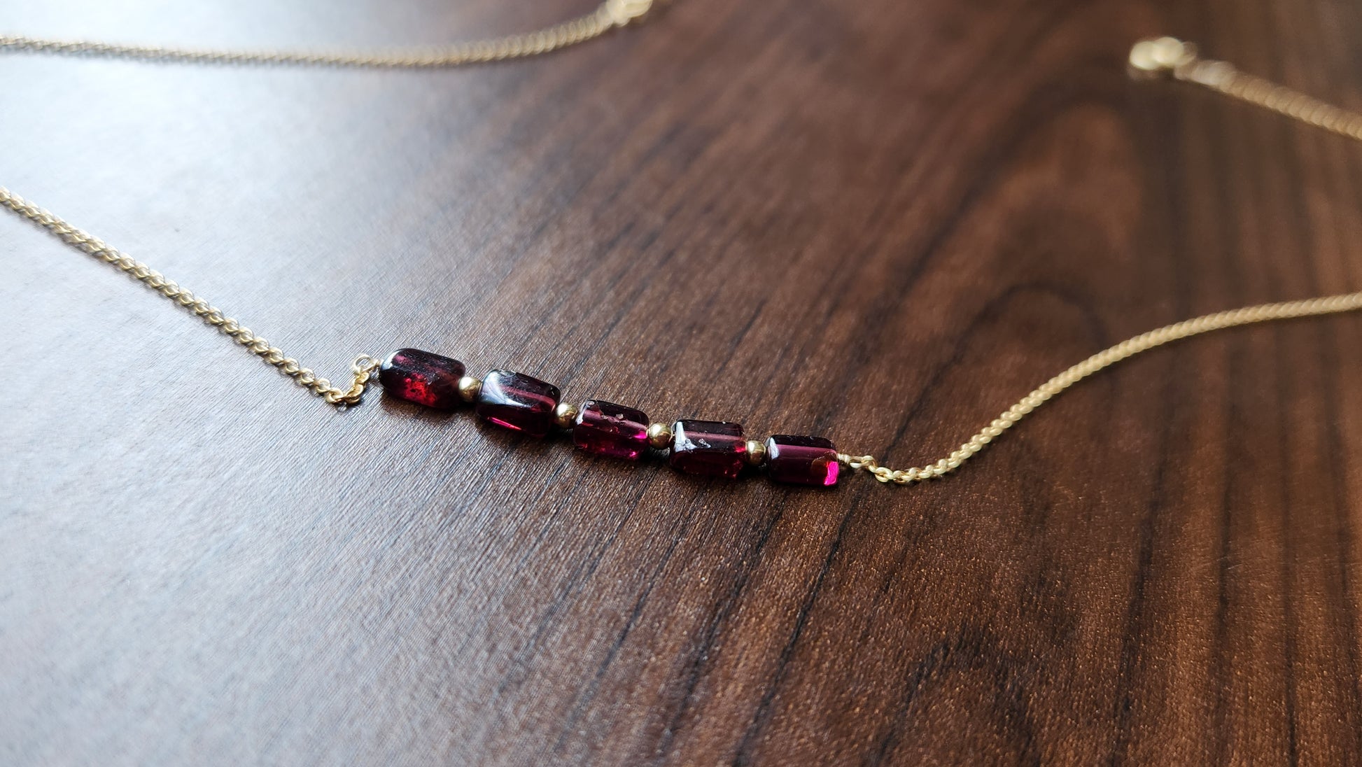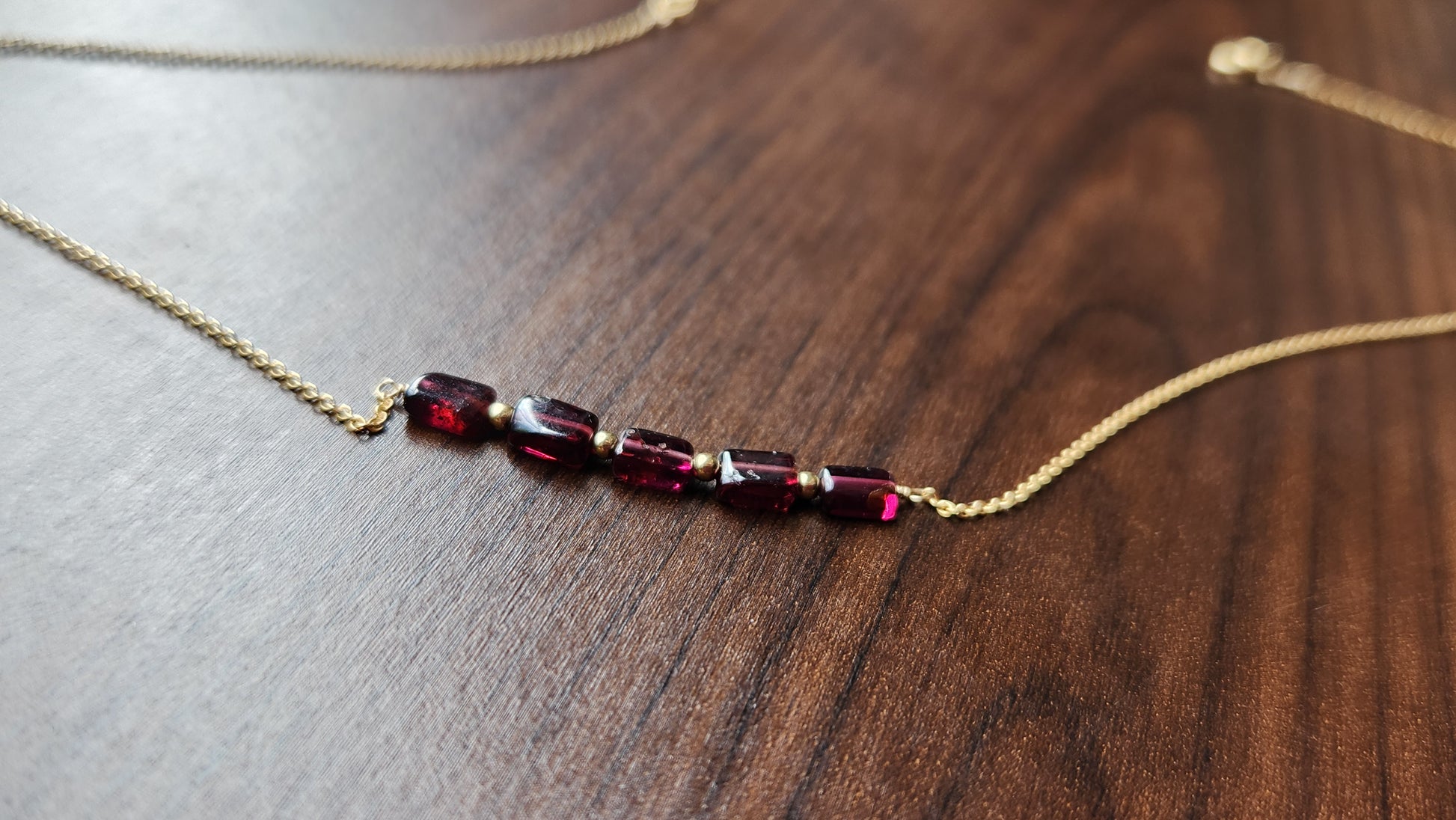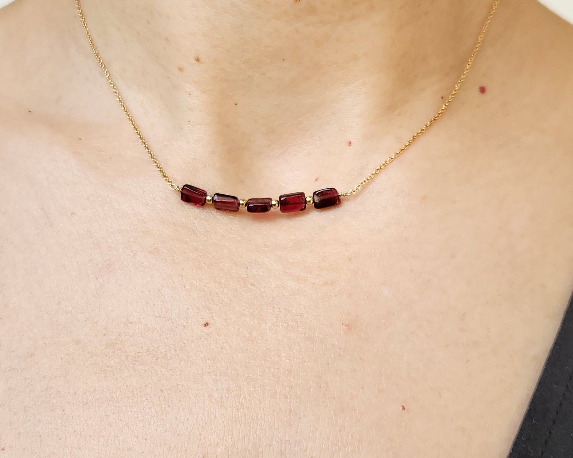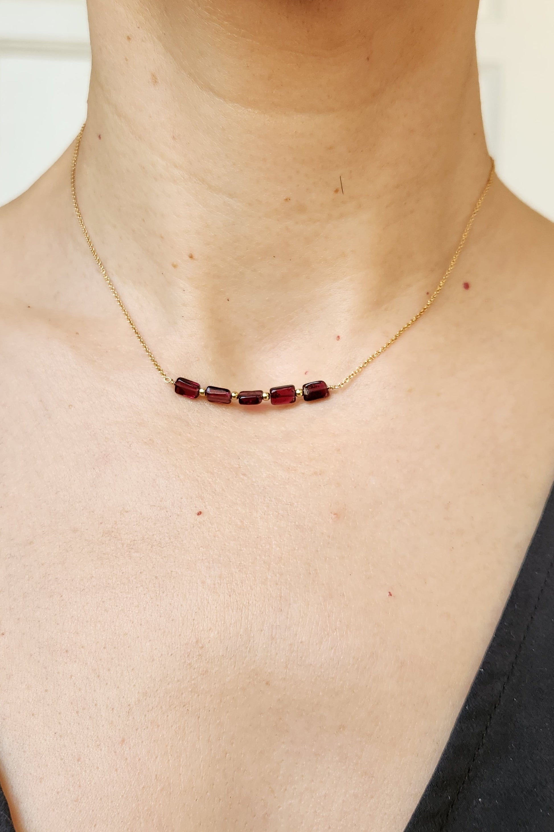 Delicate garnet gemstones align gracefully at the throat chakra, each separated by a tiny gold bead, creating an understated yet distinctive statement. Garnet's deep red color is reminiscent of the blood that runs through every human, connecting us all. 14k gold filled chain and clasp. 1" extender chain. Necklace length range: 14.5"-15.5" Handmade.