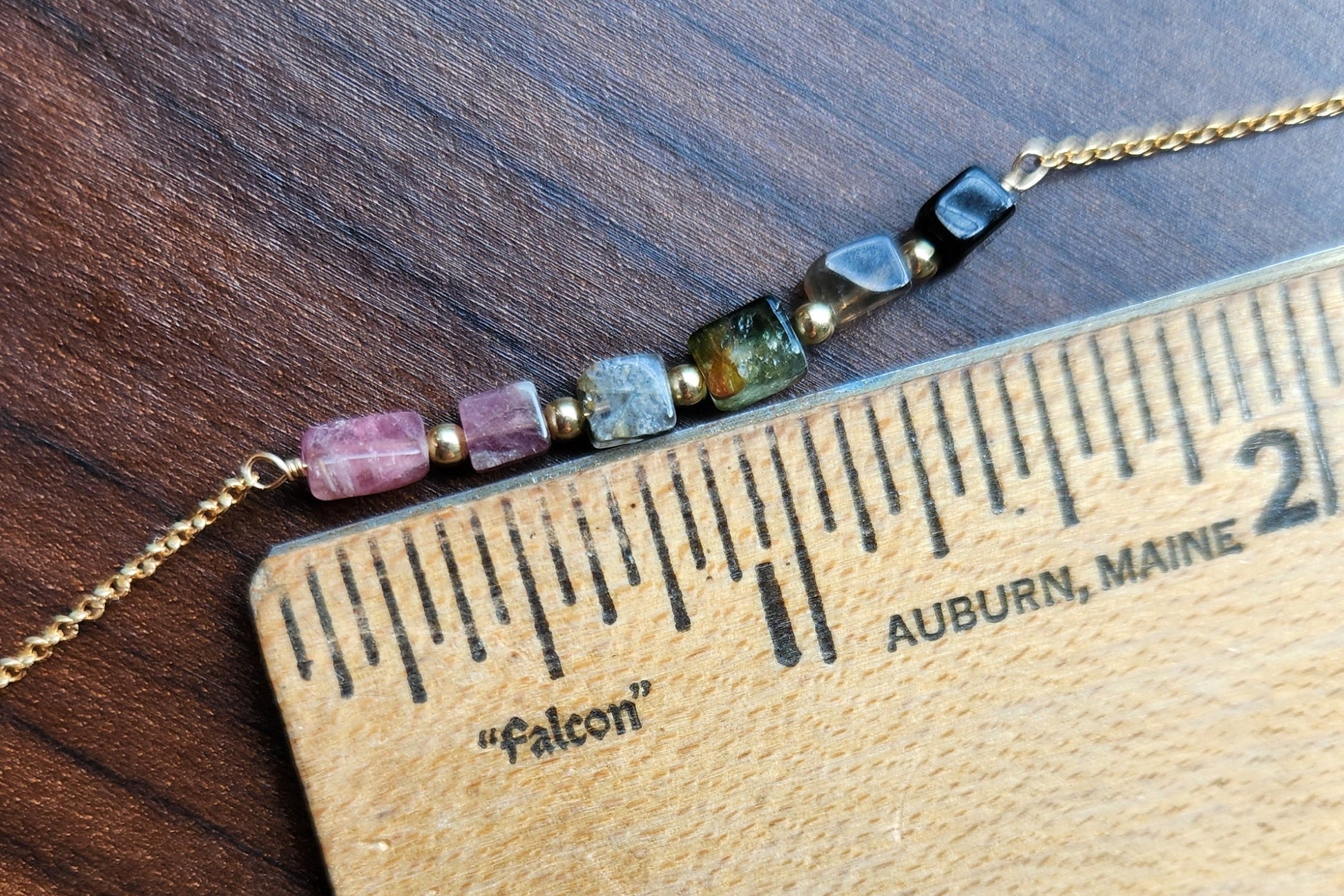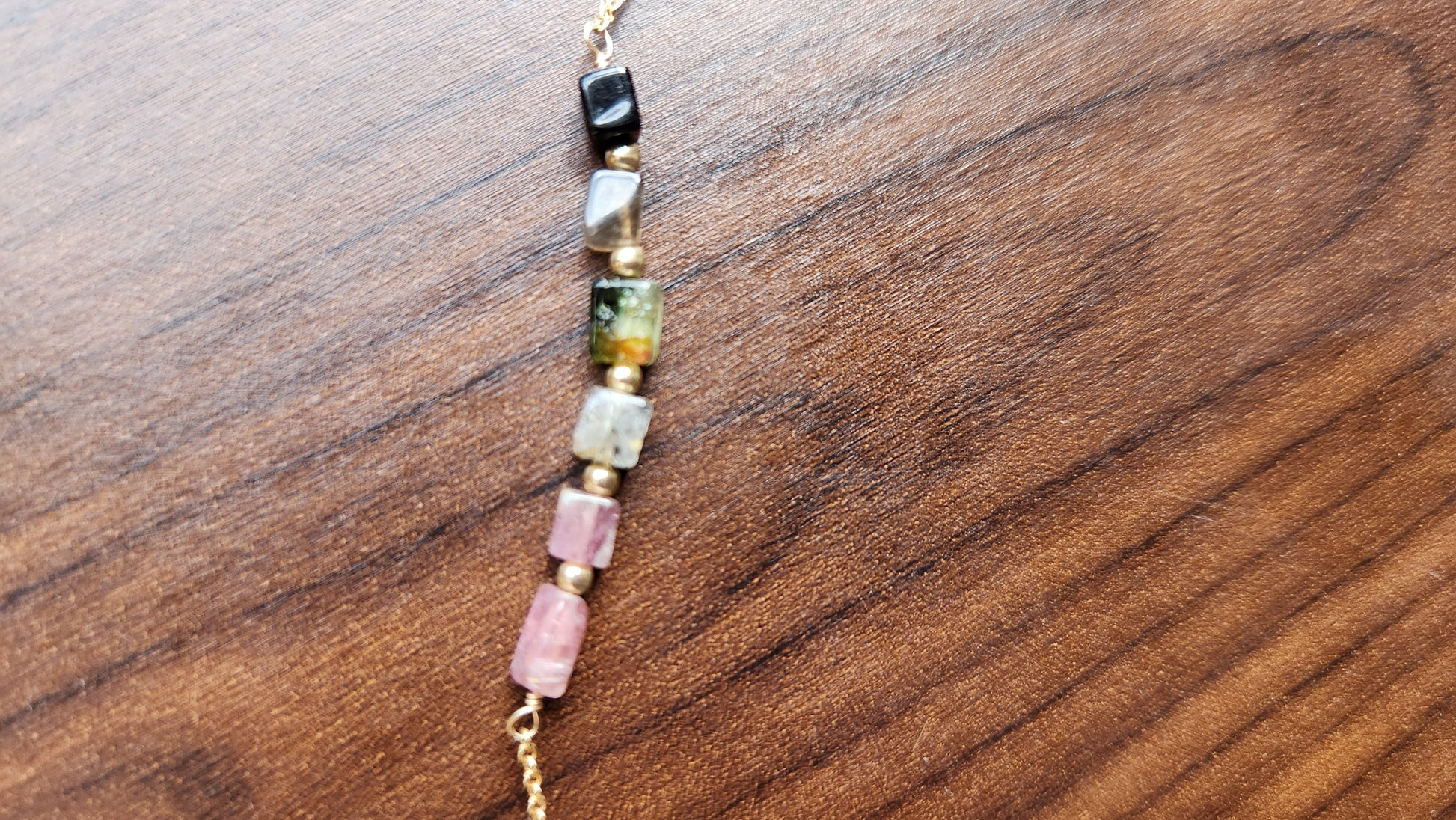 "Cosima" Tourmaline Row Necklace with 14k Gold-Filled Chain 15" Pink-Green-Black