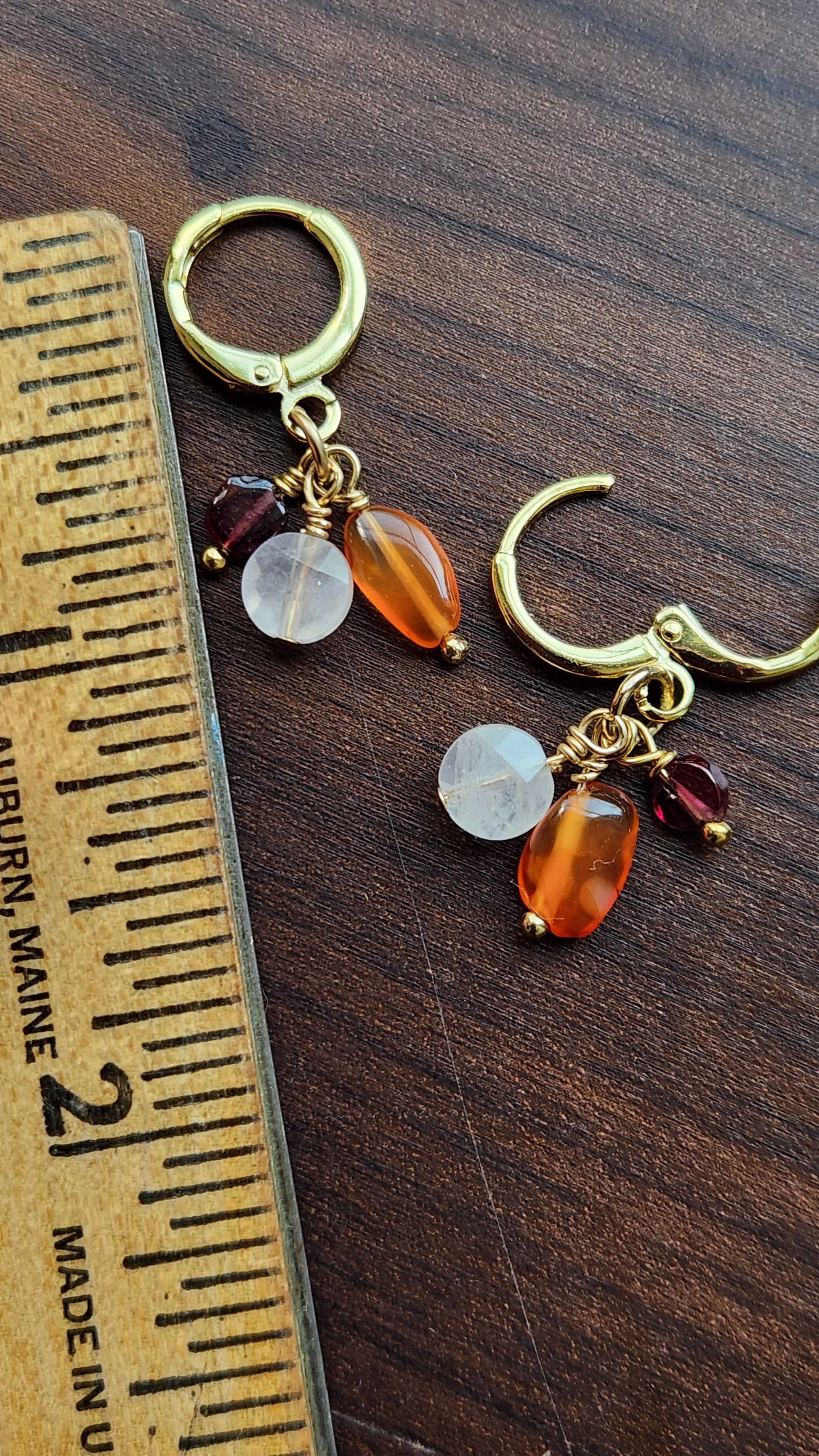 Red Garnet, light pink Rose Quartz, and orange Carnelian plus gold come together to form a jubilant trio reminiscent of a handful of fruits. 18k Gold ear clasps mean no problems with sensitivity. Real gemstones sparkle with delight. These earrings are lightweight and easy to wear. Roughly 1.25" long with 18k Gold plated clasp closure.