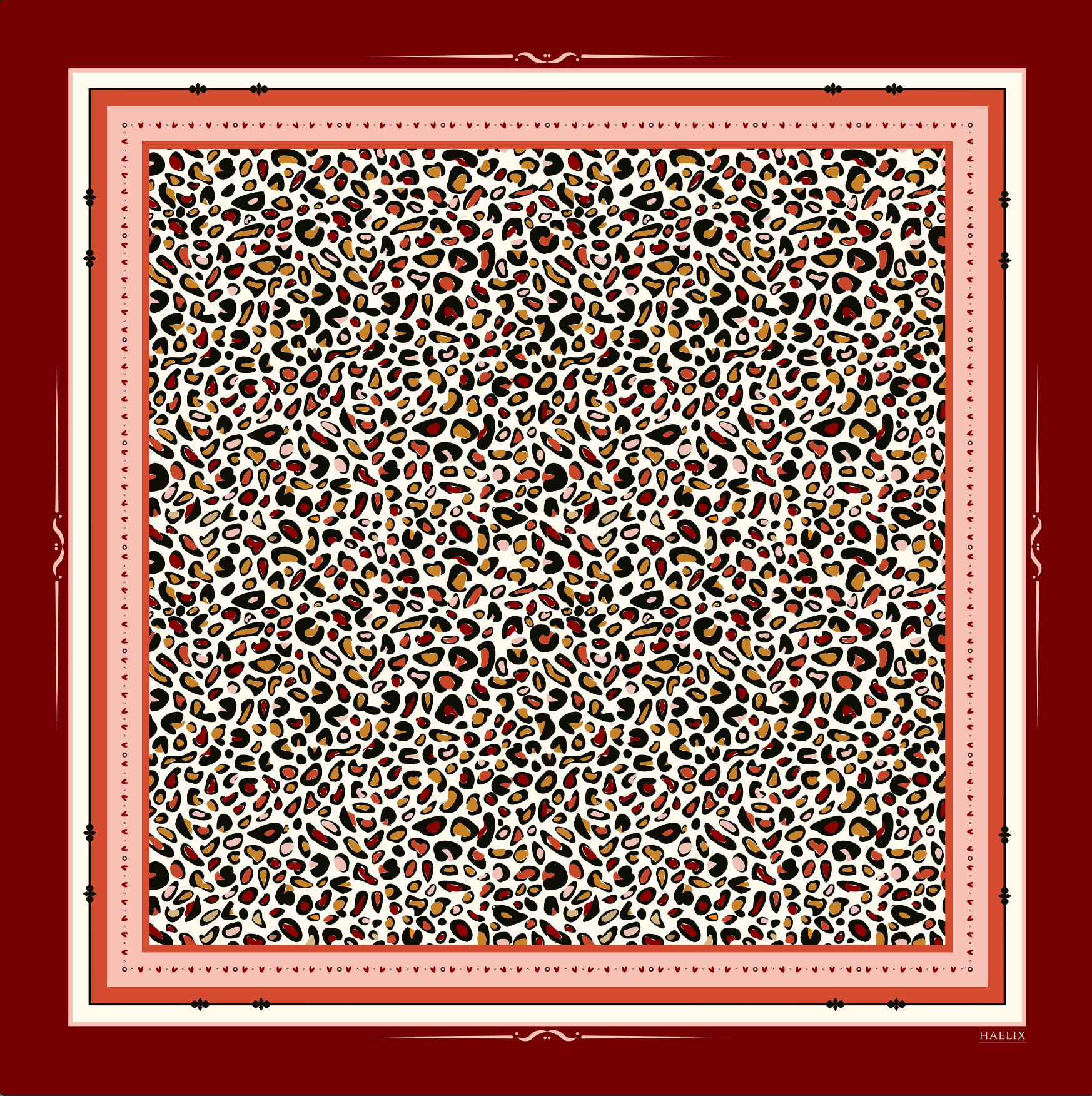 Inspired by the black toe beans of Diana's recent foster kittens; Look closely, this print appears to be slightly furry. Loren reimagines the classic leopard print in warm red, pink, and orange tones—a playful take on a timeless pattern. Crafted from lightweight 100% silk habotai, this 20 x 20" scarf offers weightless comfort and features a handrolled hem, showcasing the care put into its design. Loren is a fun and versatile accent piece features a border of subtle heart details: a tiny love letter to yourself. Easily handwashed and quick to dry. You may just find yourself reaching for this one anytime you're looking to add a fun twist to your outfits.