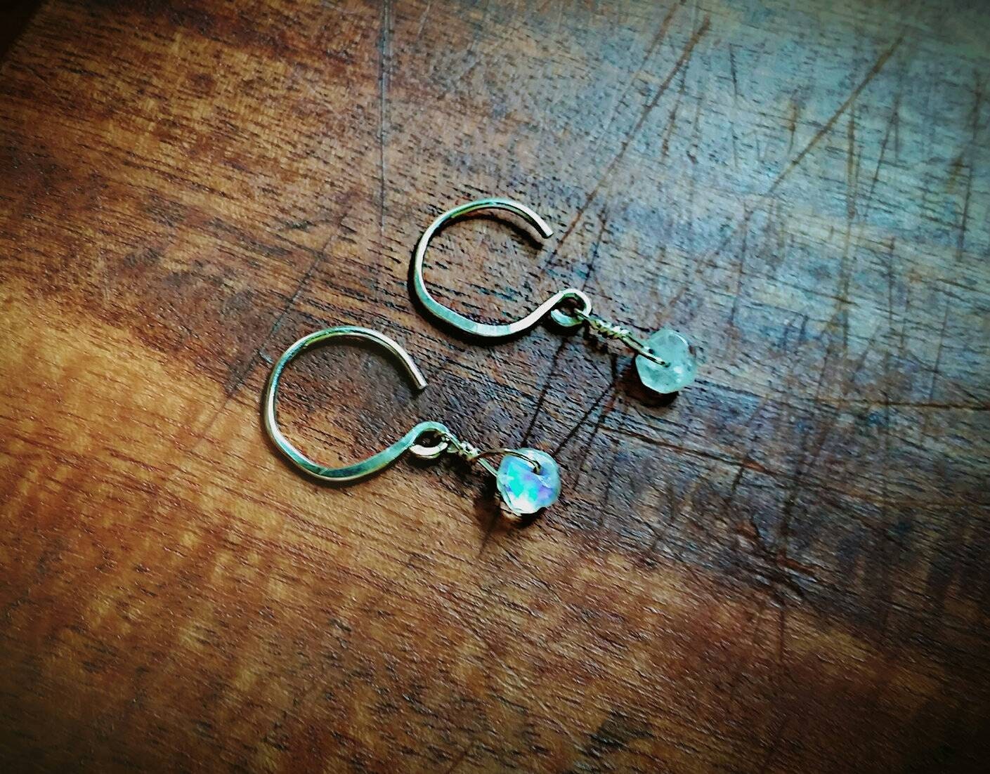 Moonstone is a captivating semi-previous gemstone that glows white with occasional, stunning flashes of blue. These earrings are perfectly understated for everyday wear. Hand-hammered Sterling Silver ear wires.