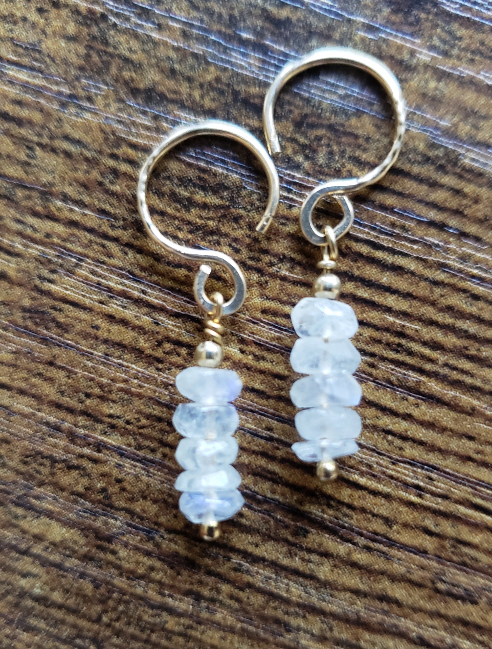 Moonstone is a captivating semi-previous gemstone that glows white with occasional, stunning flashes of blue. These earrings are perfectly understated for everyday wear. Hand-hammered Sterling Silver or 14k Gold Filled ear wires.